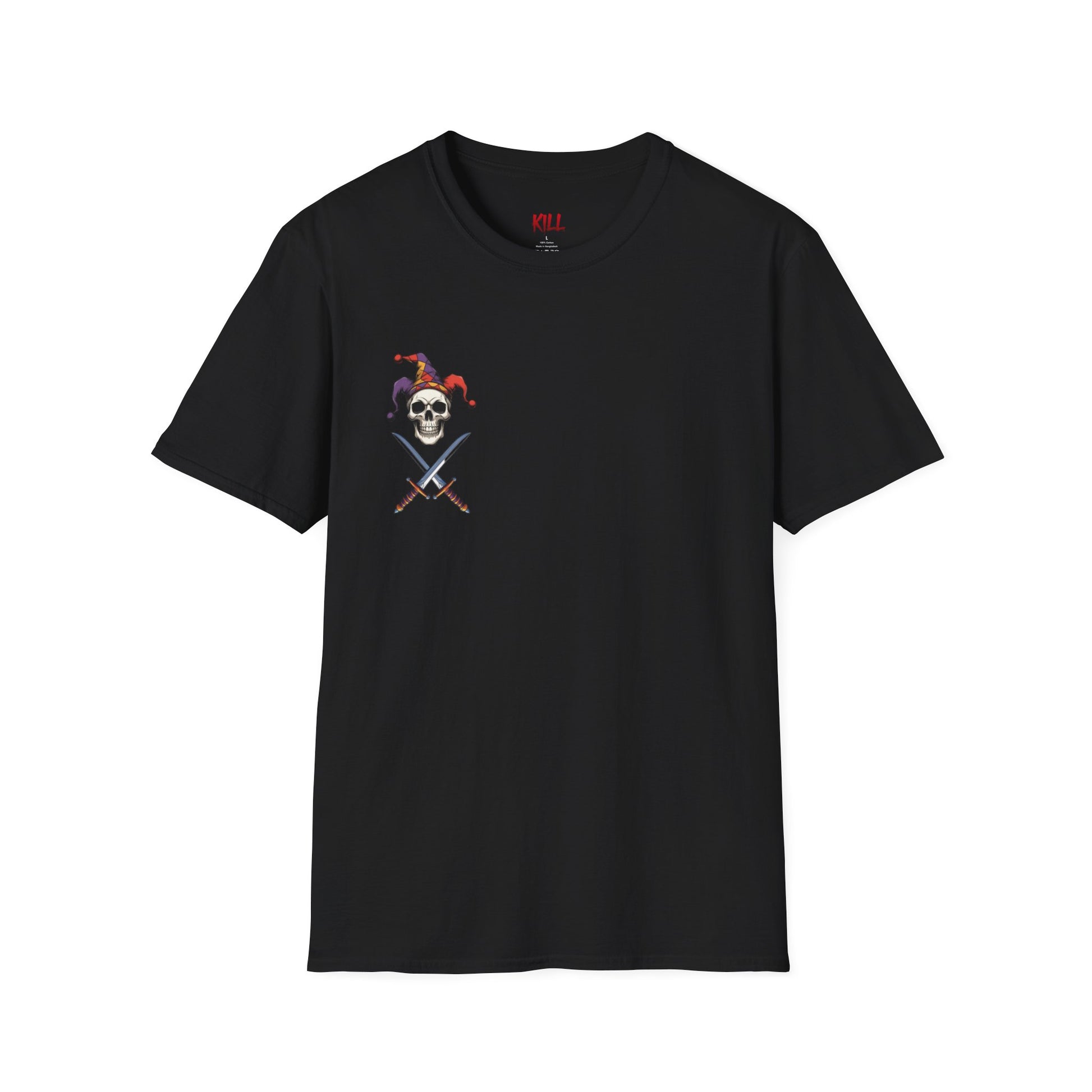 Embrace your bold personality with this unique unisex t-shirt, designed for those who love to stand out. The striking front graphic of a skull wearing a jester's hat embodies a playful yet edgy vibe, perfect for making a statement wherever you go. Whether you're heading to a casual gathering, celebrating Halloween, or just looking for a fun addition to your wardrobe, this shirt fits seamlessly into any event. Ideal for adults who appreciate creativity and humor in their style, this t-shirt is a conversation starter and a must-have for any fashion-forward individual. Great for everyday wear or as a standout piece for themed parties!